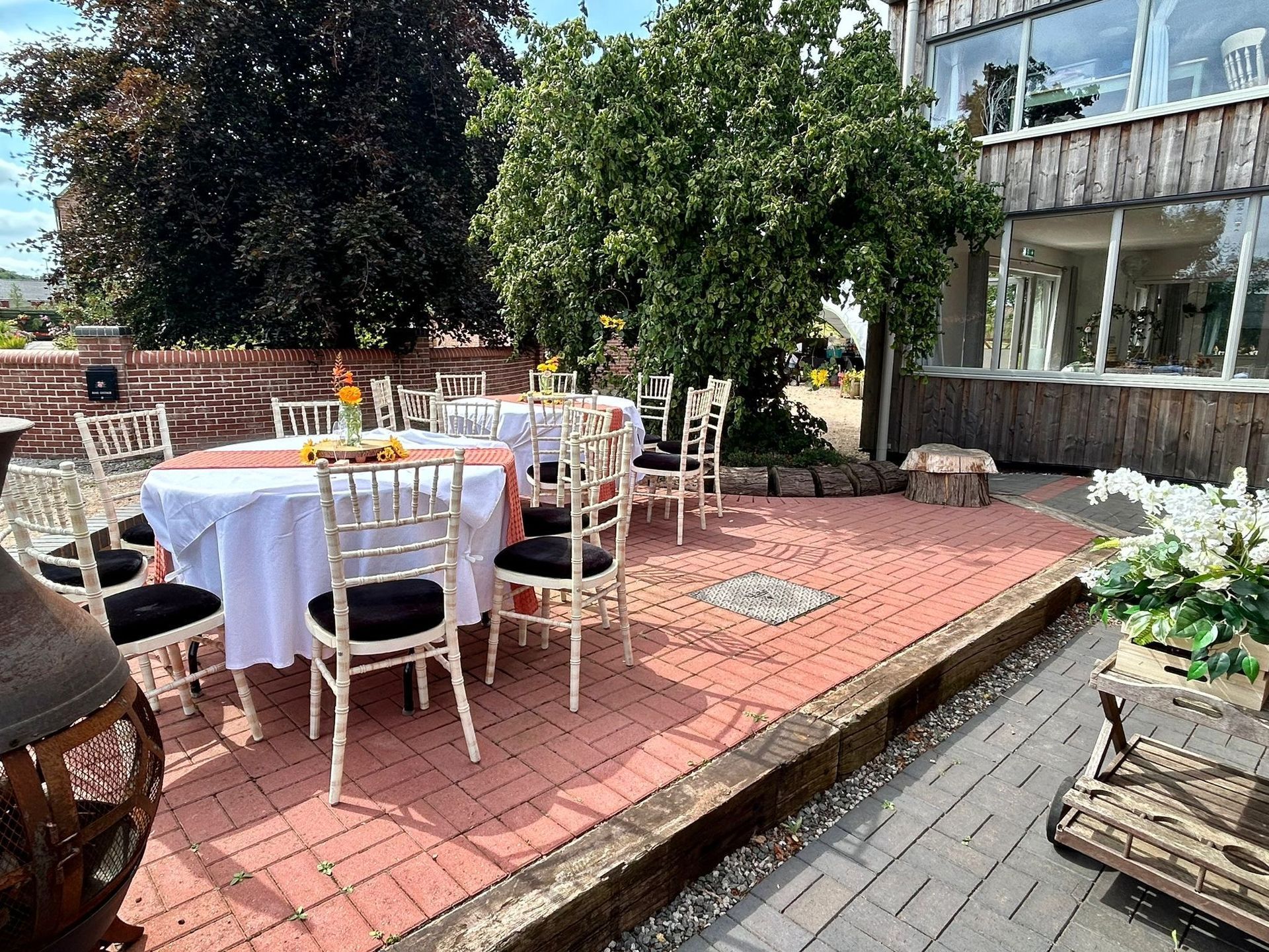 There are 70 chairs (maximum capacity) and 9 circular tables with a white tablecloth can be provided.